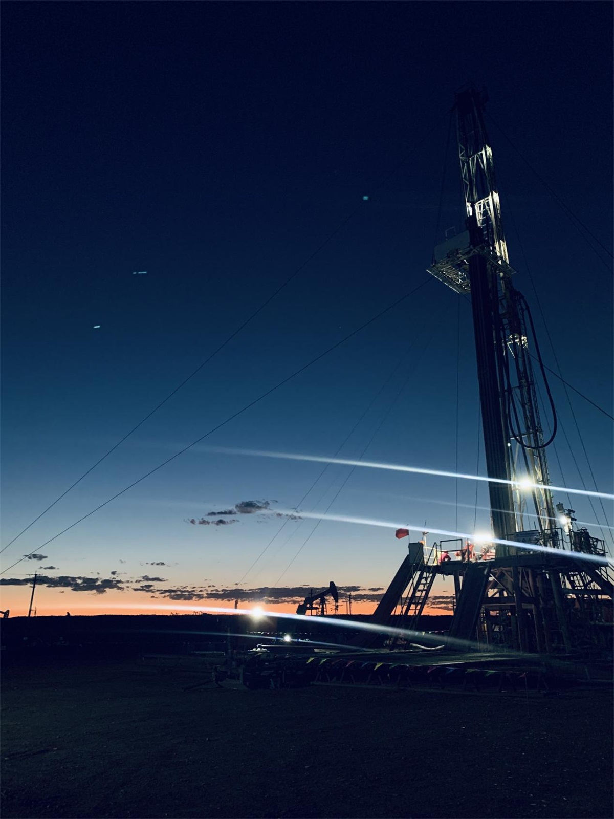 一座座“發光”的鉆塔,猶如一個個出現在眼前鋼鐵巨人,他們屹立在隔壁、沙漠,夜空中,鉆塔頂端閃爍的燈光,轟隆隆的機械聲,施工井場在夜色的襯托下顯得沸騰又繁忙。夜晚更是絢麗多彩,井架上的彩燈像繁星一樣,點綴著夜空,給正通施工現場增添了迷人的色彩。